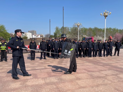 大練兵現(xiàn)場,保安員與監(jiān)察員組成方隊,陸續(xù)登場。只見隊員們精神飽滿、士氣高昂,著裝整齊、隊容嚴整,動作規(guī)范、精準有力。他們分別進行了稍息、立正、跨立,齊(跑)步行進與立定、消防技能及防暴技能演練等內(nèi)容。隊員們令行禁止,進退合一,表現(xiàn)了這是一支擁有過硬軍事素質(zhì)與嚴明組織紀律的隊伍。