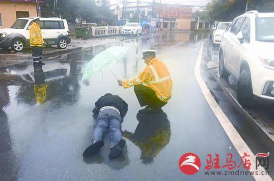馬路上車來車往,躺在路上太危險(xiǎn)了。于是,李浩罡、曾華崗試圖叫醒醉酒男子,但該男子毫無反應(yīng)。出于安全考慮,其中一人蹲下給躺在地上的醉酒男子撐起雨傘(如圖),另一人向公安派出所匯報(bào)。李浩罡和曾華崗直到民警趕到,把醉酒男子抬上警車,才回到崗位上繼續(xù)執(zhí)勤。