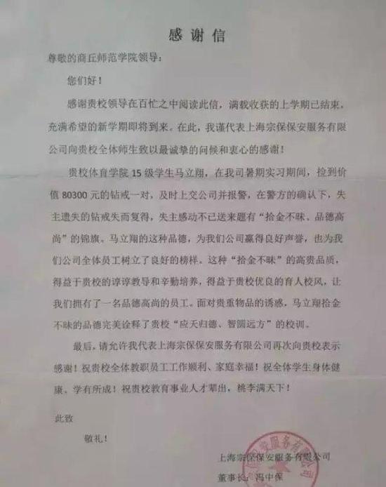此事直到張先生的一面錦旗和一份感謝信由保安公司寄往馬立翔就讀的商丘師范學(xué)院,才被人所知,校友們稱他“鉆石哥”。