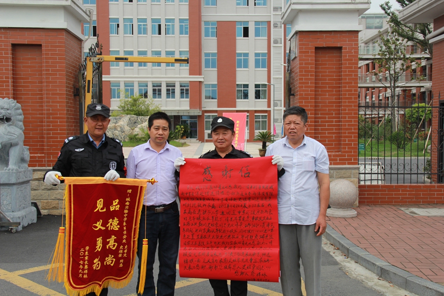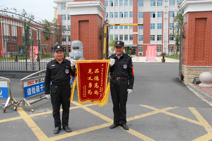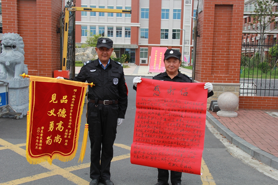 9月29日,家住城東鎮(zhèn)銀杏花苑的張榮蘭家屬特地將一面寫有“品德高尚,見(jiàn)義勇為”的錦旗及一封感謝信送到了城南實(shí)驗(yàn)中學(xué)安保處,表?yè)P(yáng)南通春雨保安有限公司駐校保安史桂榮同志挺身而出、勇救受傷路人的事跡。