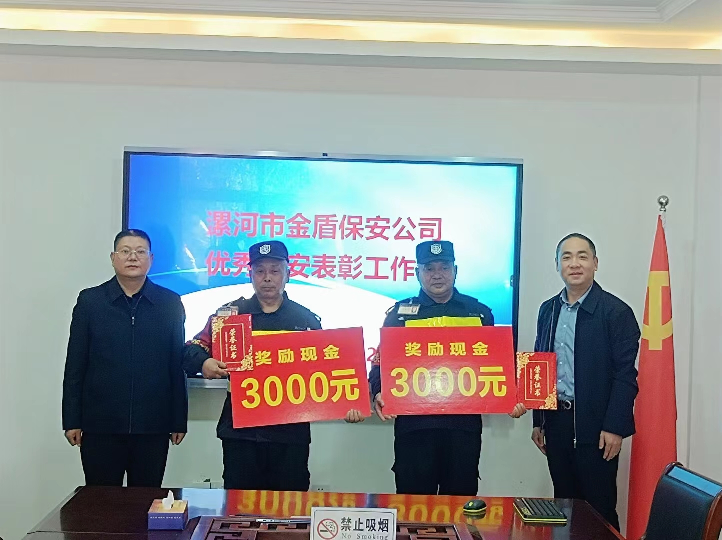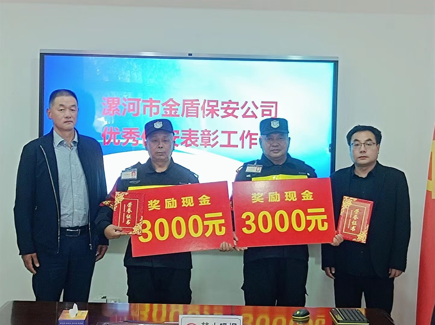2023年3月7日,漯河市金盾保安服務(wù)有限公司總經(jīng)理?xiàng)瞰I(xiàn)軍、副總經(jīng)理吳清旺、辦公室主任徐飛、源匯區(qū)二大隊(duì)大隊(duì)長劉秀金一行到漯河市第三初級(jí)中學(xué),協(xié)同漯河市第三初級(jí)中學(xué)黨委書記兼校長趙國強(qiáng)、副校長李東亮、總務(wù)副主任余海洋,共同對(duì)林四平、吳改順兩位同志進(jìn)行了表彰,每人頒發(fā)榮譽(yù)證書一個(gè),每人現(xiàn)金獎(jiǎng)勵(lì)3000元。